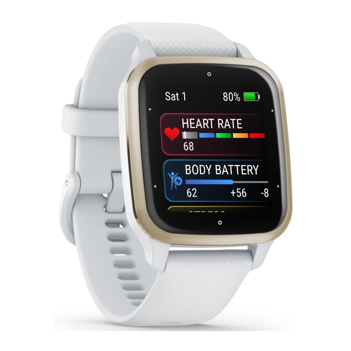 De Venu Sq 2 is uitgerust met uitgebreide gezondheidsfuncties, zoals een hartslagmeter, Pulse Ox-sensor voor zuurstofsaturatie, slaapmonitoring en stressmeting. Daarnaast beschikt het horloge over Garmin's Body Battery-functie, die je energieniveau gedurende de dag bijhoudt. Met meer dan 25 vooraf ingestelde sportmodi kun je je trainingen eenvoudig bijhouden, en geavanceerde metingen, zoals VO2 Max, geven je diepgaand inzicht in je prestaties.